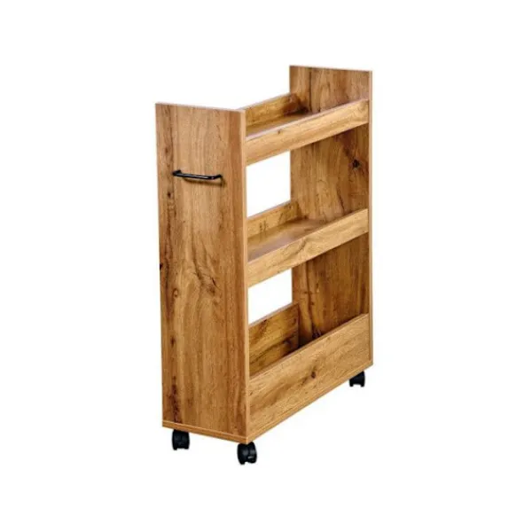 Köksvagn med 3 hyllor på 4 hjul, perfekt för att placeras mellan 2 möbler. Tillverkad av partikelboard som imiterar ek. Handtag för enklare flytt av vagnen. H 78 x P 60 x L 22 cm. Färg: Brun. Material: Trä. Höjd: 78 cm. Längd: 22 cm. Djup: 60 cm.