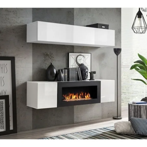 Väggskåp, FLY N. Horisontell förvaring med nedfällbar dörr bakom vilken det finns två fack. TV-skåp: med två dörrar bakom vilka det har ett fack. I mitten en bioetanolkamin.Färger: Matt vit stomme / vit front i högblank PVC.Mått: Totalmått: 160 cm x ~150 cm x 40 cm cm; 1 x Horisontell förvaring: 160 cm x 30 cm x 29 cm; 1 x TV-bänk: 160cm