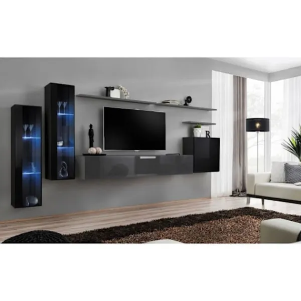 Väggsystem, Switch XI. Vitrin med en delvis glasdörr bakom vilken det finns två hyllor i glas belysta av blå LED-belysning. Två vitriner ingår. TV-bänk med en fällbar dörr som öppnas med gasfjädrar bakom vilken det finns tre fack. Fyrkantig vitrinskåp: en dörr bakom vilken det finns en hylla. Tre väggs-hyllor ingår. Kroppen har kanter i ABS.