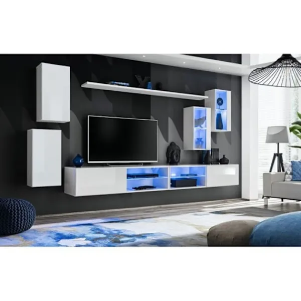 Väggmonterad TV-möbel Switch XXV, L 280 x D 40 x H 140 cm.2x hängande skåp: en hylla bakom dörren.En hylla. 2x hängande glas-skåp: delvis glasdörr, bakom en glashylla med blått ljus.2x hängande TV-möbel: en glashylla med ett blått LED-ljus på ena sidan, på andra sidan en lucka som stöds av hydrauliska stötdämpare.Fasader med öppningssystem via tryck.