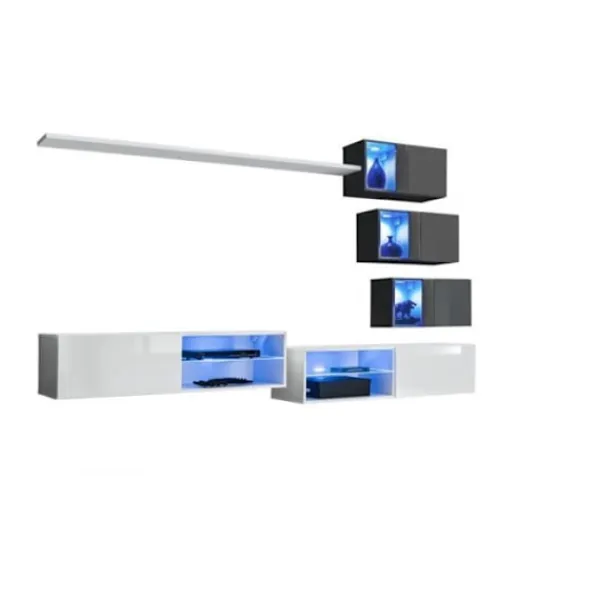 En hylla. 3x hängande garderob: bakom varje dörr ett rum. 3x hängande garderob: delvis glasad dörr, bakom rummet med blå LED-ljus. 2x hängande TV-möbel: glashylla med blå LED-belysning på ena sidan, nedfällbar top som stöds av hydrauliska kolvar på den andra sidan. Fronter med push-click öppningssystem. Mått: Hylla: 180/2,2/20 3x ar