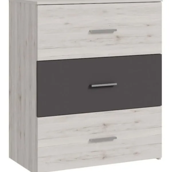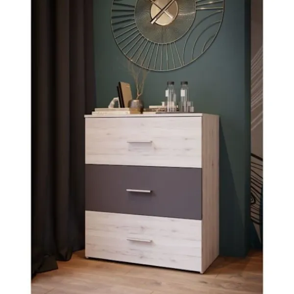 ADRIA byrå med 3 lådor: Lägg till en touch av elegans och modernitet i ditt sovrum med denna vackra byrå. Dekorpapper i ask ek med solid grå finish. Denna byrå erbjuder en elegant och modern design. Dess tre rymliga lådor gör att du enkelt kan förvara dina kläder och accessoarer. Mått: 75 2 x 41 3 x 89 7 cm. Referens: ADRIA IRDK211-J51.