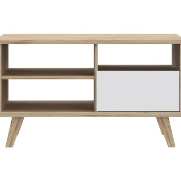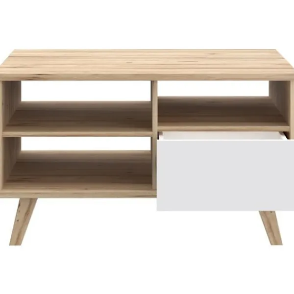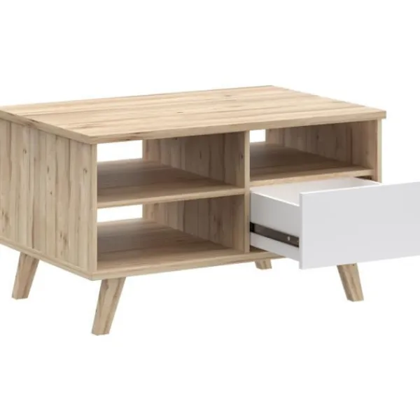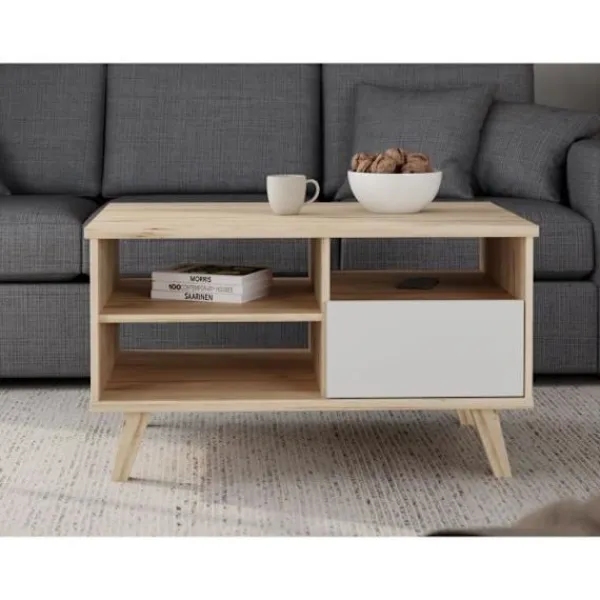 Ge ditt vardagsrum en touch av modernitet och värme med soffbordet VANKKA. Med sin eleganta rektangulära design som kombinerar naturlig ek och matt vit passar den perfekt in i alla moderna interiörer. Dess träben säkerställer optimal stabilitet medan lådan och tre nischer erbjuder praktiskt förvaringsutrymme för dina tidningar fjärrkontroller eller dekorativa föremål. Den är kompakt (90 x 60 x 51 8 cm) och är idealisk för små utrymmen utan att kompromissa med stilen. En funktionell och estetisk möbel som kommer att förbättra ditt vardagsrum.
