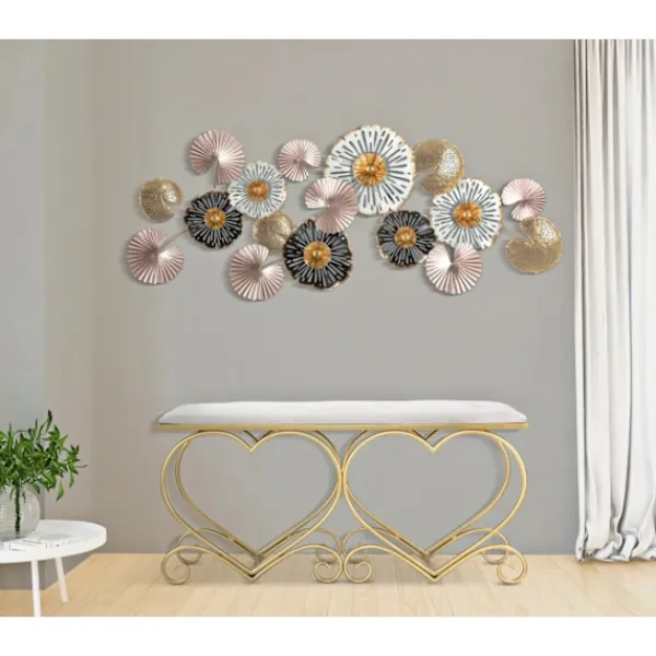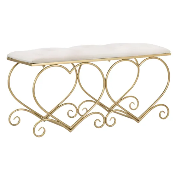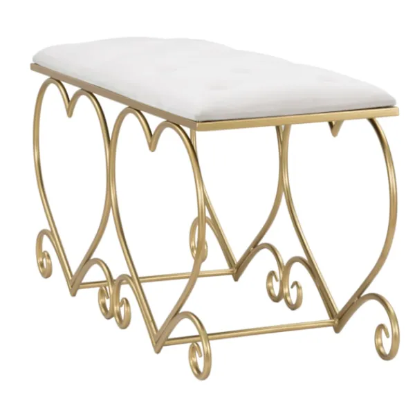 Denna eleganta bänk kombinerar gyllene metall med krämfärgad klädsel och erbjuder en hjärtformad design som ger glamour till vilket rum som helst.
