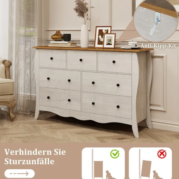 Upplev den perfekta blandningen av mysighet och elegans med vår 7-lådor Farmhouse Dresser, ett elegant tillägg som förvandlar vilket rum som helst till ett varmt och inbjudande utrymme. Denna utsökta byrå är mer än bara en möbel; det är ett uttryck för stil som förhöjer estetiken i ditt vardagsrum, sovrum eller hall. Tillverkad av högkvalitativa material, den här byrån är designad för att motstå påfrestningarna av daglig användning samtidigt som den erbjuder gott om förvaringsutrymme med sina sju hopfällbara lådor. Inkluderandet av två pålitliga tippskyddssatser säkerställer att säkerheten aldrig äventyras, vilket gör det till ett mångsidigt och säkert val för ditt hem.