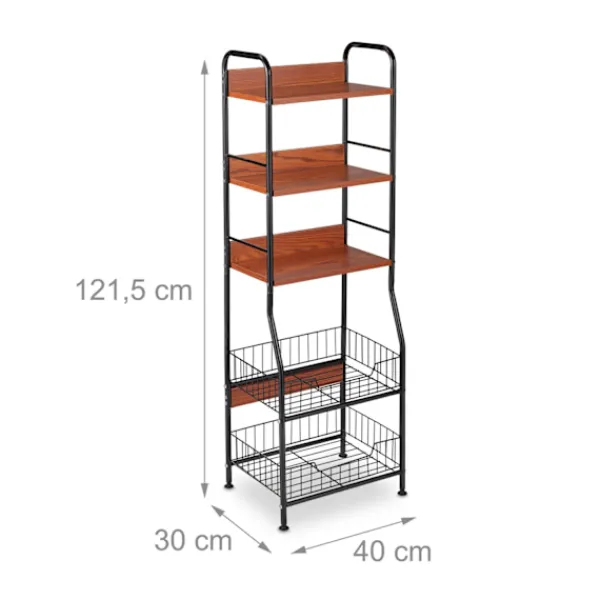 Denna smala förvaringshylla maximerar köksutrymmet och erbjuder organiserad förvaring av grönsaker och redskap. Dess öppna design säkerställer luftflöde och håller produkterna fräscha och tillgängliga.