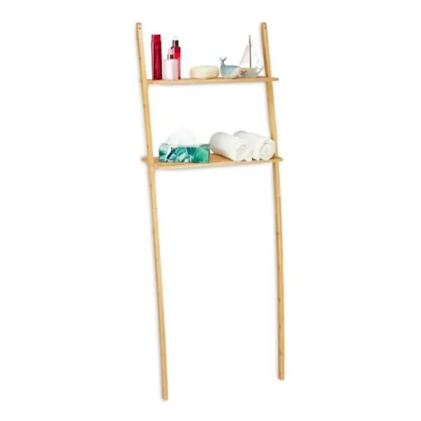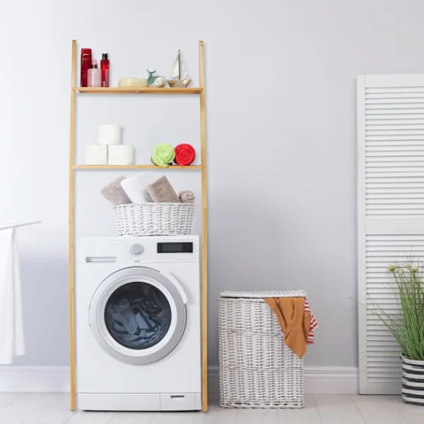 Maximera badrumsförvaringen med denna bambuhylla, perfekt för att organisera ovanför tvättmaskiner eller toaletter. Dess naturliga bambukonstruktion passar fuktiga miljöer och erbjuder hållbarhet och stil.