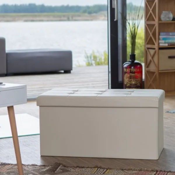 Den fällbara bänken erbjuder mångsidiga sittplatser och förvaring, perfekt för att optimera utrymmet. Förvara enkelt kuddar, filtar och mer i denna eleganta, hopfällbara sittlåda, utformad för stabilitet och stil.