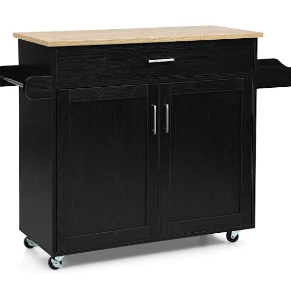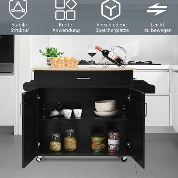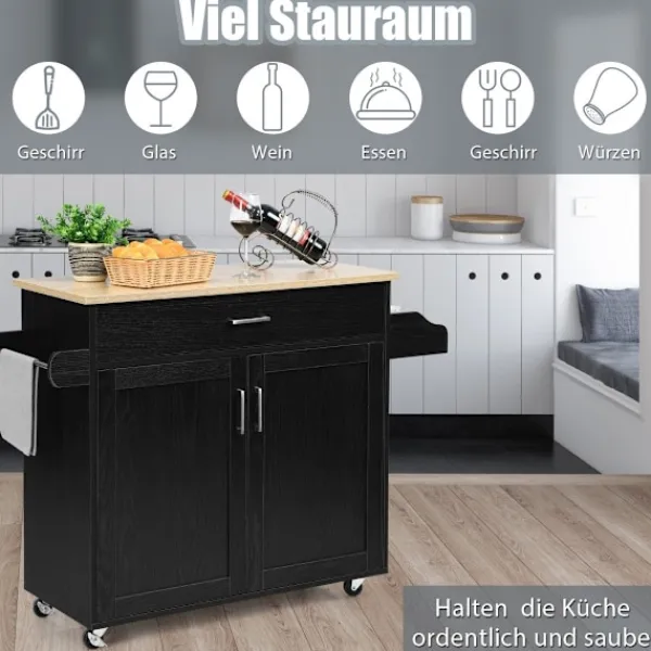 Utrustad med en rymlig bänkskiva, en stor låda och ett skåp, erbjuder den här vagnen gott om förvaringsutrymme för porslin, glas, mat och mer. Den inre hyllan kan justeras till tre olika positioner, vilket gör att du kan anpassa hyllhöjden för att passa dina förvaringsbehov. Ett specialdesignat kryddställ och handdukshållare gör det enkelt att komma åt dina handdukar och kryddburkar när det behövs. Med 4 universalhjul, varav 2 med bromsar, ger den både rörlighet och säkerhet.