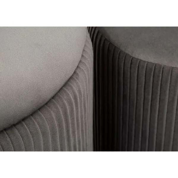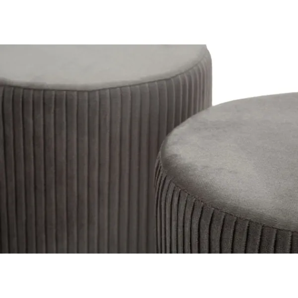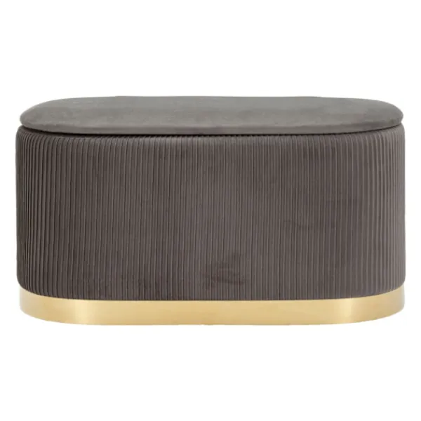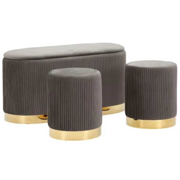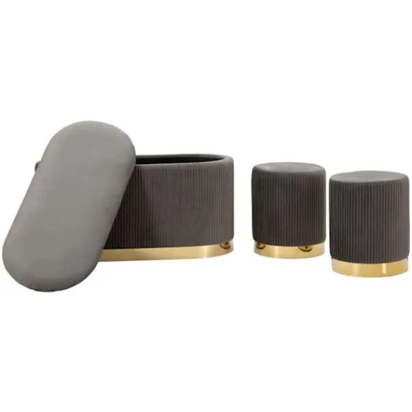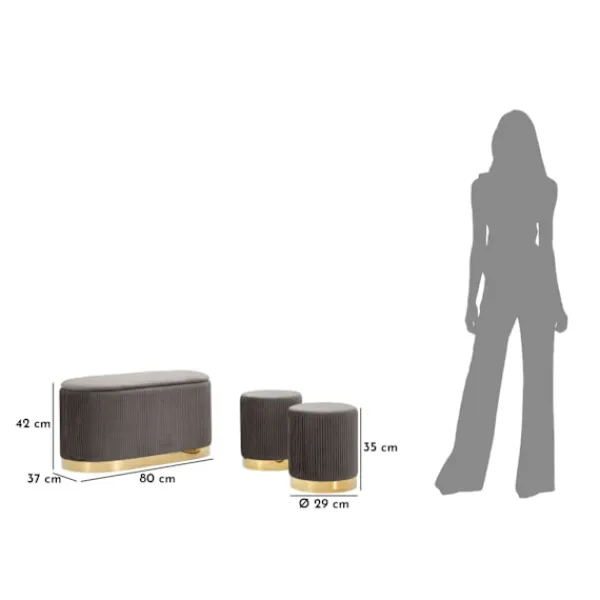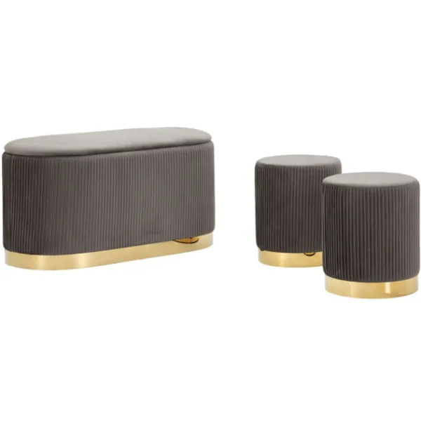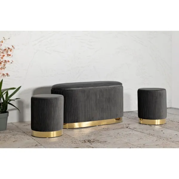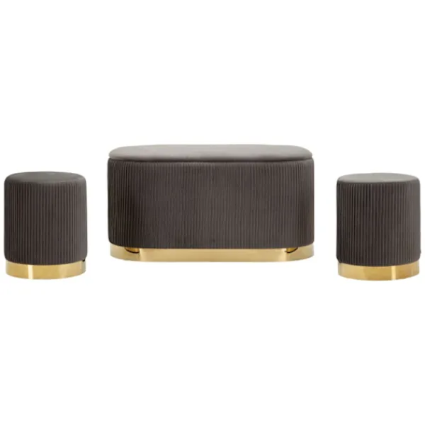 Förbättra ditt utrymme med denna eleganta bänk i containerstil och två grå sammetsveckade pallar, perfekta för att ge en raffinerad stil till vilken entré, sovrum eller vardagsrum som helst.