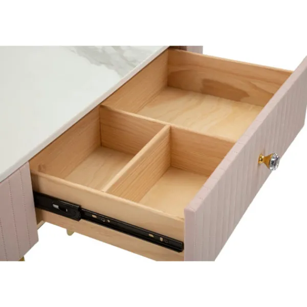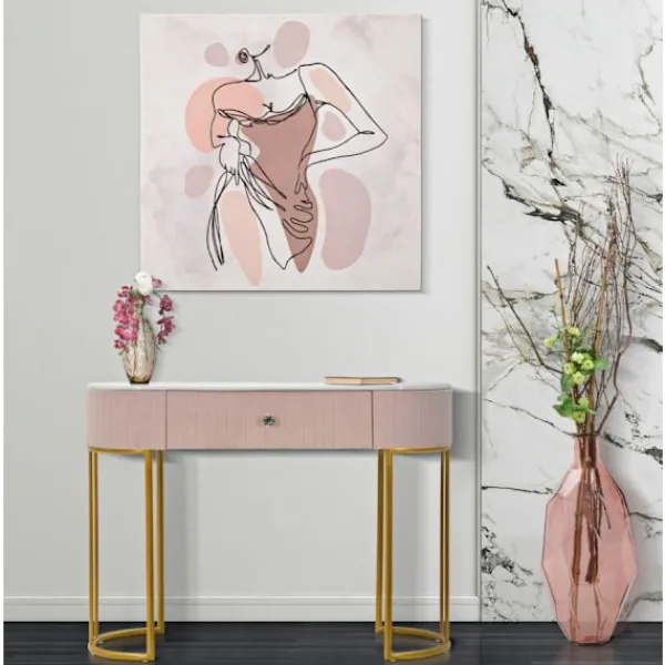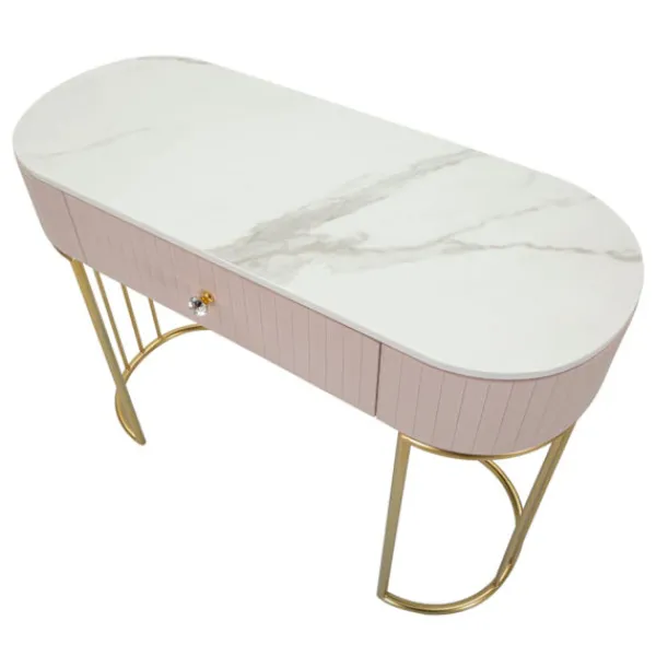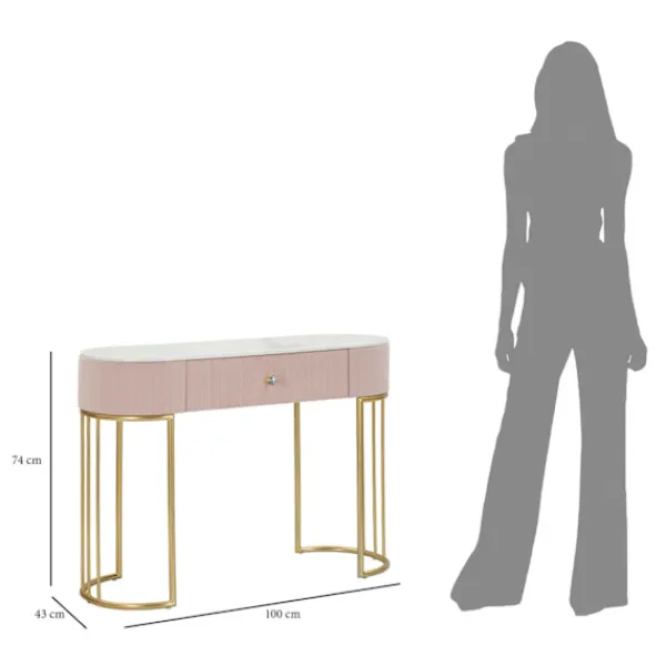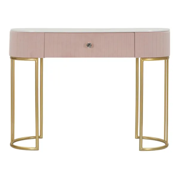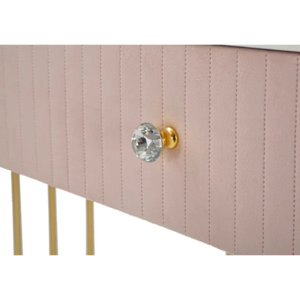 Förbättra ditt utrymme med detta eleganta rektangulära konsolbord med en gyllene metallstruktur och en rosa vadderad tygfinish. Perfekt för mångsidig inredningsintegration.