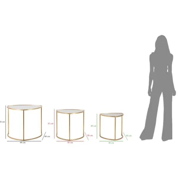 Förbättra ditt vardagsrum med denna uppsättning triangulära soffbord med en gyllene metallstruktur och glasskivor för en modern touch. Perfekt för mångsidig styling och funktionalitet.