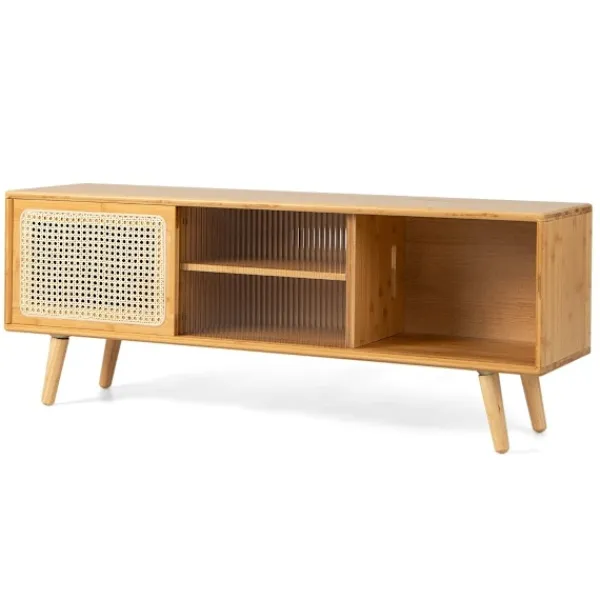 Det eleganta utseendet på detta TV-konsolskåp i naturlig bambufärg ger en fantastisk atmosfär till ditt vardagsrum, vilket gör det varmt och inbjudande. Skjutdörren i härdat glas har en räfflad design för stil och avskildhet. Det målade bambufodralet motstår sprickbildning eller deformering över tiden, stöds av fyra gummiträben som håller skåpet stabilt och säkerställer en hög bärförmåga. De detaljerade instruktionerna som medföljer gör monteringen enkel, så att du kan njuta av ditt nya TV-ställ på nolltid.
