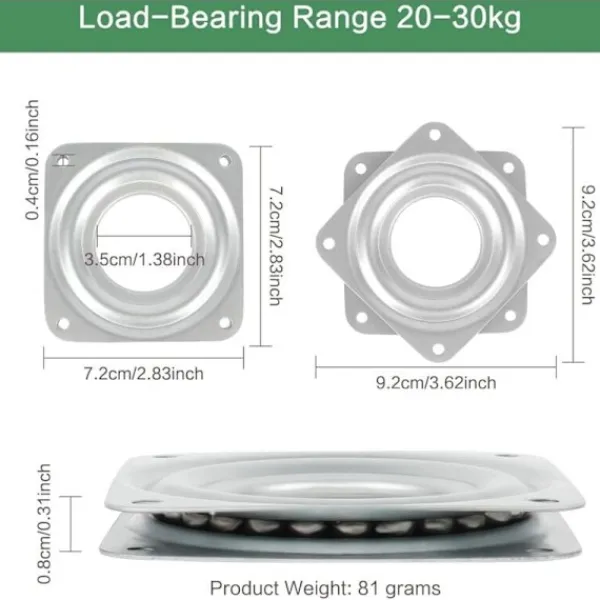 Total storlek: Storleken på den roterande svängplattan i metall är cirka 72 x 72 mm (L x B); centrumdiametern är cirka 3,5 cm. Laddningskapacitet: 30 kg.