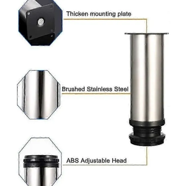 Storlek: 50mm x 150mm (Diameter x Höjd) Material: 304 Rostfritt Stål + Stark ABSTotal Justerbar Höjd: 150mm-165mm Användning: skåp, arbetsbänkar, bord, DIY-möbler, etc. Paketinnehåll: 4 x justerbara fötter; 16 x monteringsskruvar