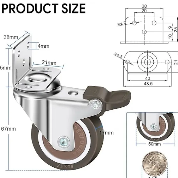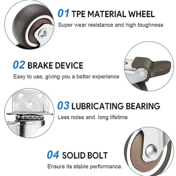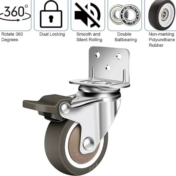 Golvskydd Det är inlindat i mjukt polyuretanmaterial för att säkerställa att det inte blir några repor eller märken på golvet och är lätt att flytta.Stabil struktur Diameter: 50 mm. Svänghjulsdäcken är tillverkade av robust hårdgummi, den stabila stålkonstruktionen kan transportera föremål upp till 100 kg. (Upp till 27 kg per hjul) Tack vare den galvaniserade stålramen kan hjulen enkelt användas både inomhus och utomhus.Förstärkt design Den L-formade monteringsplattan sparar utrymme och är lätt att installera. De nyligen förbättrade fem monteringshålen fixerar styrskenan i horisontell riktning och är inte lätta att deformera. Hörnen är förstärkta för att göra monteringsplattan mer stabil.Brett utbud av applikationerAnvänds vanligtvis i små projekt och för att flytta möbler, inklusive sminkbord, lådor, underskåp, etc. Sängen, skohyllan, leksakskistor, skåp, bokhyllor, stafflier, etc.Vad du får2 x Svänghjul med broms, 2 x hjul utan broms{PL}