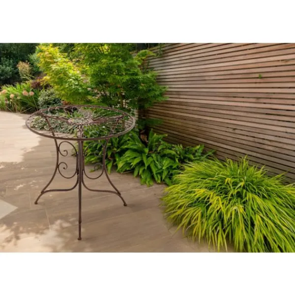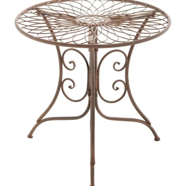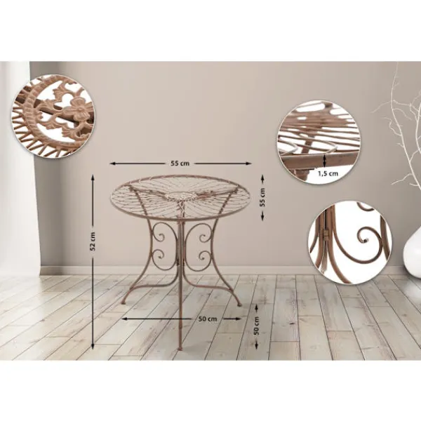 Sidobord i Jugendstil. Med sin kompakta storlek är sidobordet i Jugendstil idealisk för mindre balkonger, terrasser och inre utrymmen. Bordstoppen har en vacker patina som matchar de eleganta dekorationerna. Det runda balkongbordet är tillverkat av lackerat järn och är skyddad mot väderinflytande och därför väderbeständigt. Järnbordet är underhållsvänligt och kan enkelt rengöras med en fuktig trasa och milt tvättmedel .. Detaljer:. Tabellens diameter: 55 cm. Tabellhöjd: 52 cm. Diameter på tabellchassit (botten): 50 cm. Tjockleken på bordet: 1,5 cm