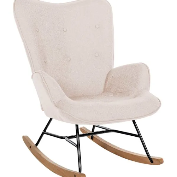 Swing Chair – ger rörelse i ditt liv!. Rockingstolen är en bekväm, robust och samtidigt snygga sittplatser för daglig användning. Det moderna möbler passar idealisk i nästan alla vardagsrum. Den bekväma sittskålen med tygklädsel säkerställer trevlig sittkomfort. Knapparna på ryggstödet ger en fashionabel touch. De elegant formade löparna av bokträ är skruvade med en svart lackerad metallram med hög kvalitet, vilket ger stolen sin stabilitet. En vacker möbler som du kommer att njuta av länge!. Materialkomposition: 100% polyester. Ca. mått:. Total höjd: 98 cm. Total bredd: 71 cm. Totalt djup: 88 cm. Sitshöjd: 48 cm. Sätet (BXD): 62 x 55 cm. Höjd ryggstöd: 64 cm. Höjd armstöd (från marken): 58 cm. Maximal belastning: 136 kg. Vikt: 16 kg. Session:. Klädsel: tyg. Trevlig sittplats genom ryggstödet. Bekväm är även efter flera timmar. Chassi:. Material: Metall. Robusta löpare av trä. Praktisk svängfunktion. Detaljer :. Robust konstruktion och hållbart klädsel. Modern gungstol. Solid finish. Underhållsinstruktioner:. Ta lätt förorening med fuktig bomullsduk. Ytor endast med lämplig fästning dammsugning. Använd inte hushållens rengöringsagenter