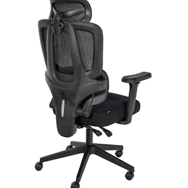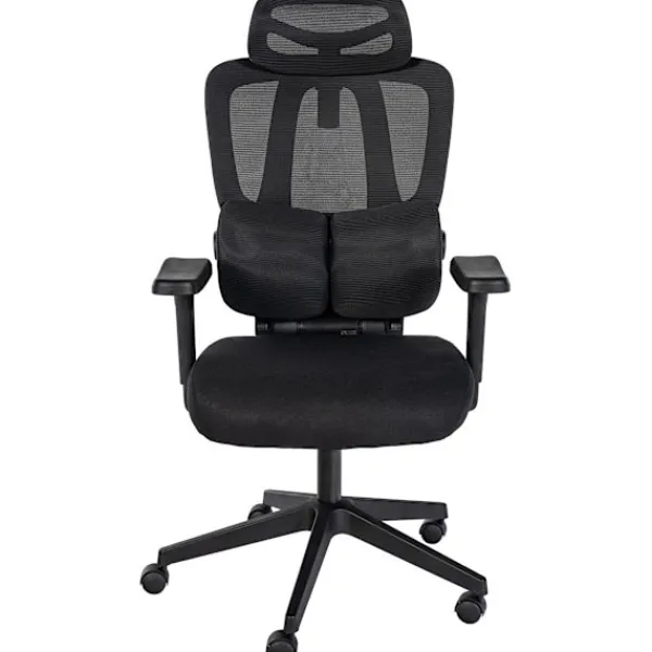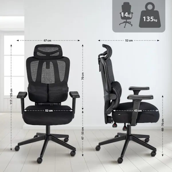 Ergonomisk kontorsstol. Upplev extraordinär sittkomfort och otaliga ergonomiska funktioner med denna kontorsstol, lämplig för kontor, skrivbord och hem på arbetsplatsen. Ryggstödet erbjuder ett bekvämt ländryggstöd och ett höjd -justerbart nackstöd. Dessutom kan ledstången lutas och låsas för maximal komfort upp till 135 grader. Armstödet lindrar nack- och axeldelen och är justerbara i tre riktningar (höjd, framåt/bakåt, roterbar) .. ryggstödet är täckt med ett höglättande och andningsbart nätmaterial, vilket gör svängbar målet bekvämt, även på sommardagar. Med den högkvalitativa gaslyftningen är den rotlösa i höjd justerbar. Den mycket robusta ramen med flexibla hjul säkerställer en stabil position. Den maximala lastkapaciteten är 135 kg .. Detaljer:. Total bredd: 67 cm. Total höjd: 117 – 125 cm. Höjd med lutat rygg: 107 – 115 cm. Totalt djup: 52 cm. Djup med lutat rygg: 89 cm. Sitshöjd: 47 – 55 cm. Sätet (B X D): 52 x 43 cm. Höjd ryggstöd: 55 cm. Höjd rygg med nackstöd: 70 cm. Höjdarmstöd: 68 – 76 cm. Max. Skattebildbarhet: 135 kg. Vikt: 14 kg. Materialkomposition: 100% polyester. Session:. Klädsel: Hållbart tyg. Ryggstöd med högt och andningsbart nätverk. Med höjdjusterbar nackstöd, ländryggstöd och 3D-armstöd. Ryggstöd kan lutas och låsas upp till 135 grader. Chassi:. Material: Plast. Höjdjusterbar och roterbar