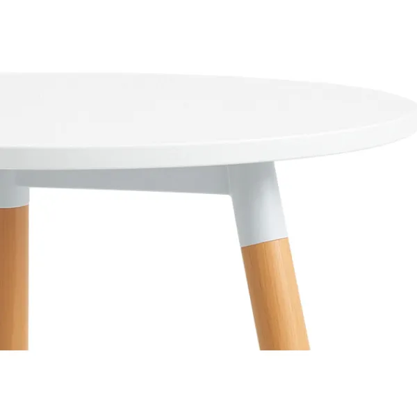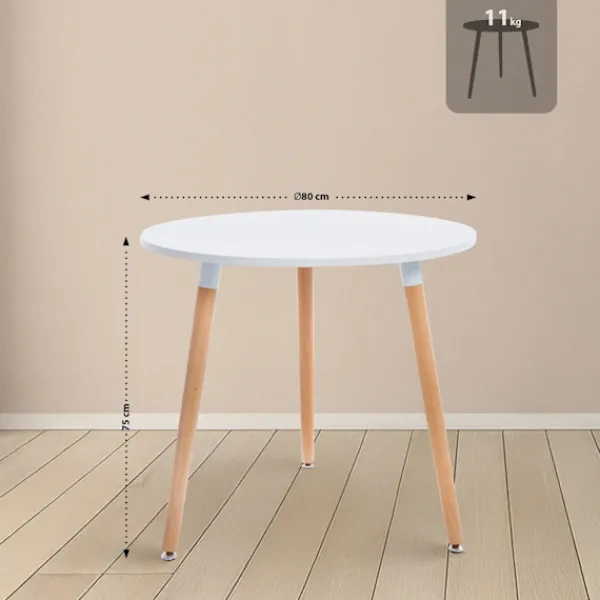 Den runda bordets topp är gjord av MDF och står på robusta bok i boken. Stolarna har en robust plaststol och ett ryggstöd som lyser upp trycket på baksidan.