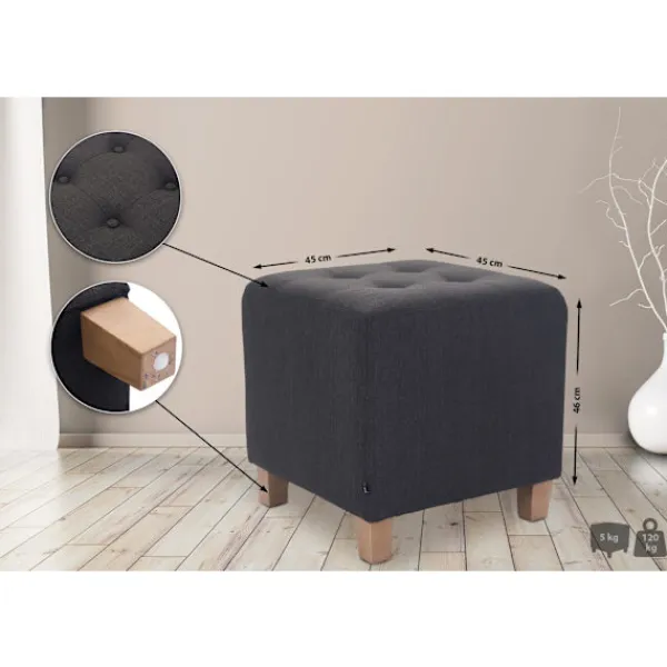 Sitz -pall. Denna sittpall strålar modern elegans och passar lätt i olika inre stilar. Det kan också användas som en bas av foten .. Med sitt sömda dammbeläggning erbjuder Ottomanen inte bara komfort, utan också en modern design som harmoniseras i både sovrummet och vardagsrummet. Dessutom är klädseln särskilt hållbar och hållbar .. Kubstolen är fast på robusta träben, så att avföringen kan laddas med högst 120 kg. Tack vare golvskyddarna skyddas känsliga golv. Enkel montering kräver endast att fästa de fyra benen. Det nödvändiga materialet och monteringsmanualen ingår. Materialkomposition: 100% polyester. Detaljer :. Total bredd: 45 cm. Total höjd: 46 cm. Totalt djup: 45 cm. Max. Lastkapacitet: 120 kg. Vikt: 5 kg. Session:. Klädsel: tyg. Tjock fyllning för bättre sittkomfort. Styliskt sömnad sätesbeläggning. Chassi:. Material: trä. Säker position. Underhållsinstruktioner:. Torka av lätt föroreningar med en fuktig bomullsduk. Ytor bara dammsugar med en lämplig borste. Använd inte hushållens rengöringsagenter