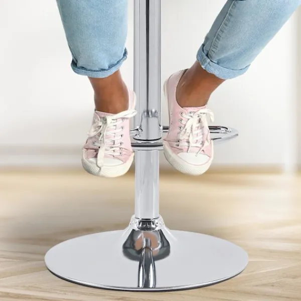 Den kromfärgade metallramen och den fashionabla klädseln ger avföringen ett elegant och förfinat utseende. Sätet kan täckas med en hållbar och elegant sammet. Tack vare den höjdjusterbara ramen och 360 -graders rotationsfunktion har du mycket rörelsefrihet.
