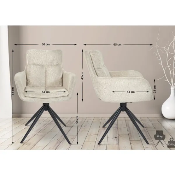 Modern och bekväm matsalstol. Den moderna och moderna matsalstolen erbjuder hög sittplatskomfort. Denna klädda stol är ett utmärkt val för ditt matbord, kök, vardagsrum, men också andra utrymmen. Det bekväma sammanträdet bestäms av den trevliga klädseln av sätet, ryggstödet och armstödet. Sätet är täckt med ett underhållsvänligt och robust tyg. Tack vare den så kallade svängningsfunktionen kan stolen rotera 180 grader, vilket erbjuder extra rörelsefrihet. Grunden för denna fåtöljliknande stol är den matta-svarta fyra-ben ramen av robust järn, som säkerställer en problemfri belastning på upp till 120 kg. Både subtila och glada färger finns tillgängliga – totalt sju stycken .. Materialkomposition: 100 % polyester. Detaljer :. Total höjd: 88 cm. Total bredd: 60 cm. Totalt djup: 65 cm. Sitshöjd: 50 cm. Sitsyta (B x D): 42 x 43 cm. Höjdarmstöd: 23 cm. Höjd ryggstöd: 43 cm. Max. Lastkapacitet: 120 kg. Vikt: 10 kg
