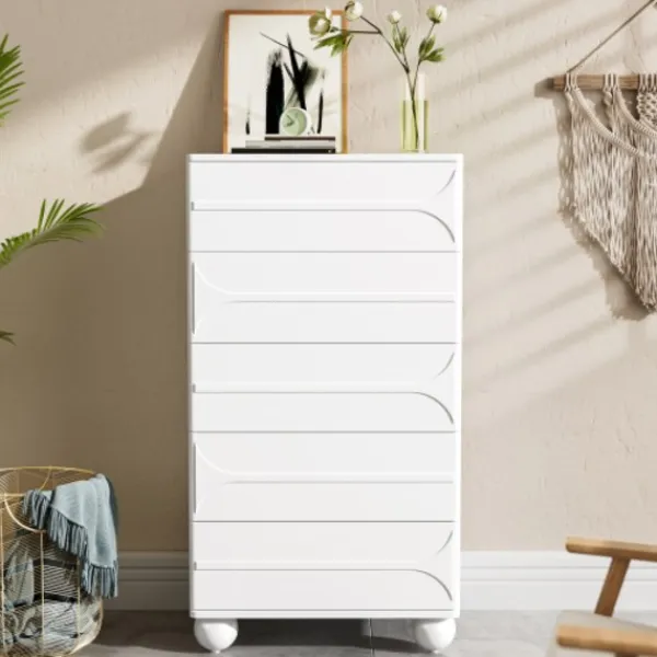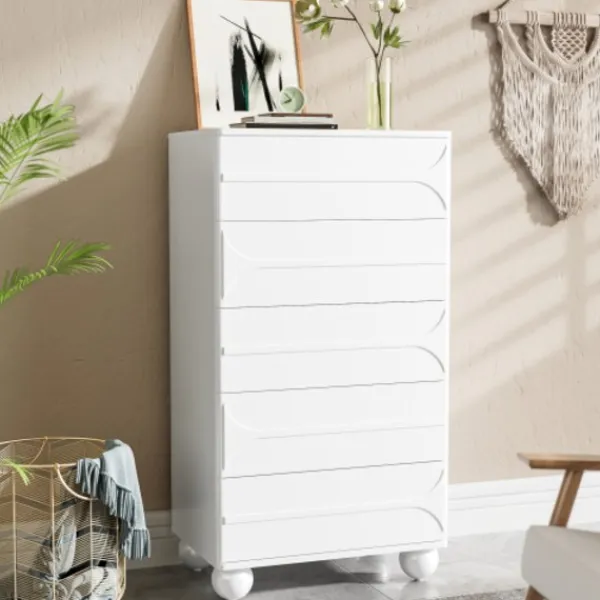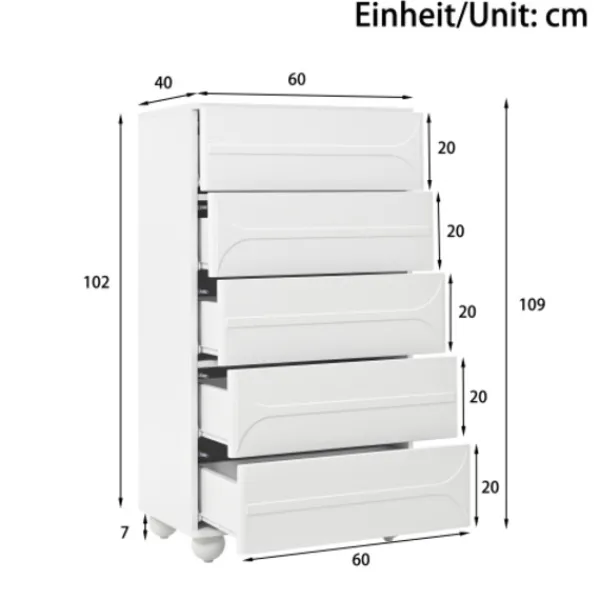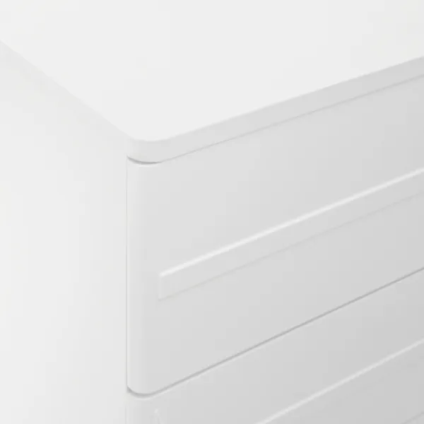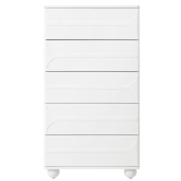 5 lådor med elegant präglingsdesign – vita metallfötter, rymlig förvaring, rundade hörn