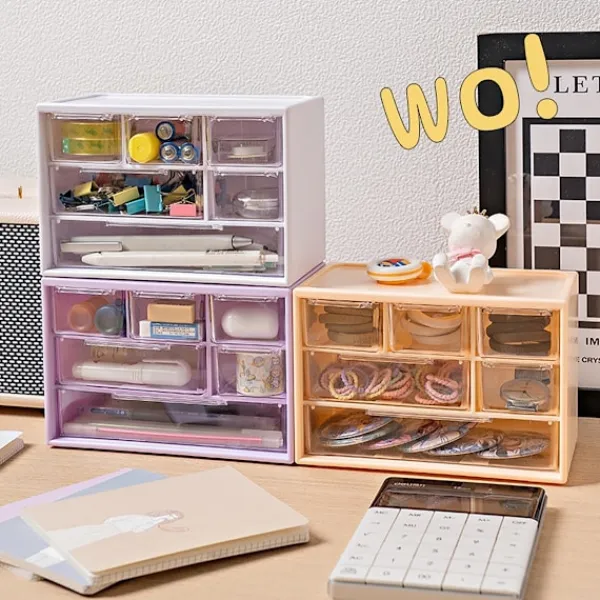 Storlek på Innehållet: Små plastförvaringslådor med en övergripande förvaringslåda och sex transparenta lådor, förvaringslådans storlek är 18 cm * 12 cm * 9,8 cm, kan endast förvara små kontorsartiklar och hantverksmaterial.