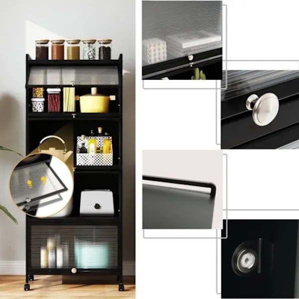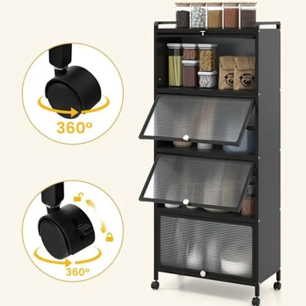 Denna COSTWAY kökshylla är utrustad med 4 svängbara hjul för enkel förflyttning. Dörrar kan dras in för att spara utrymme. Den är gjord av metall och mäter 60 x 32 x 154 cm. Varje nivå kan bära upp till 15 kg vikt.