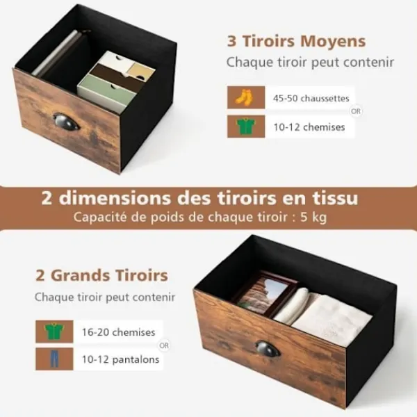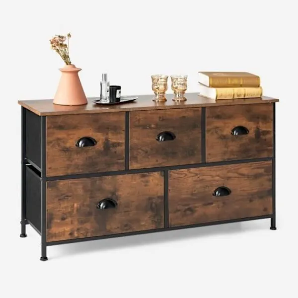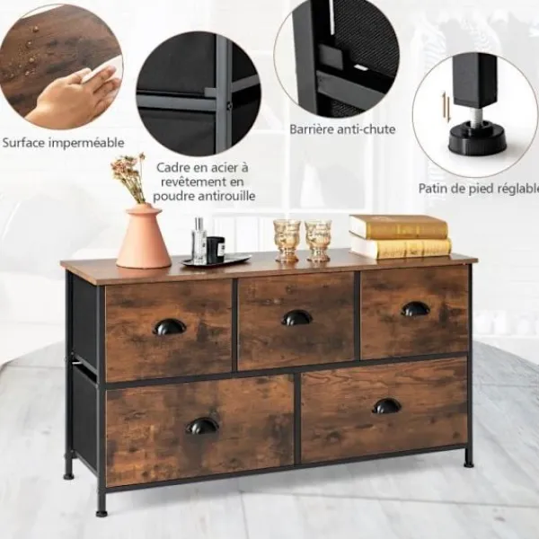 Denna COSTWAY byrå i non-woven har ett stort förvaringsutrymme med topp och 5 lådor, inklusive 2 avtagbara och vikbara storlekar. Metallhandtagen och de justerbara glidarna gör den lätt att flytta. Den är utrustad med fallskydd för ökad säkerhet.