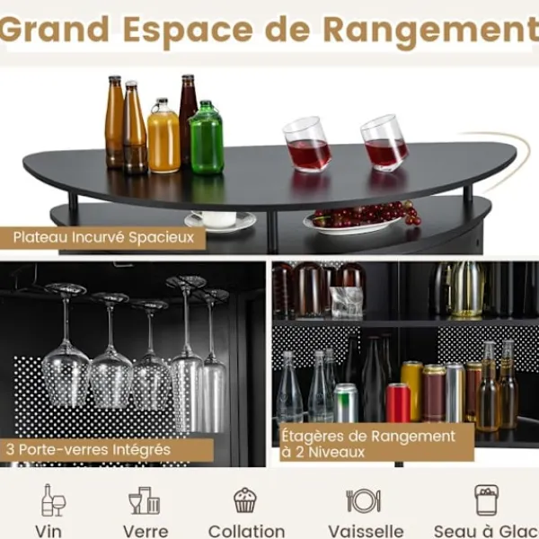 >1 kurvad arbetsyta, 1 öppen hylla under ytan, 2 hyllor och 3 fotglasstöd för ett stort förvaringsutrymme