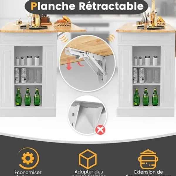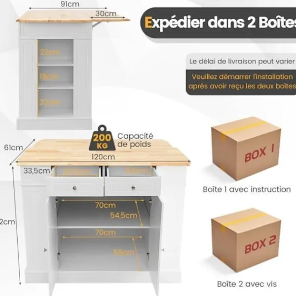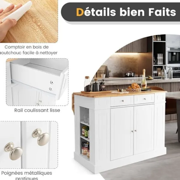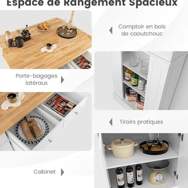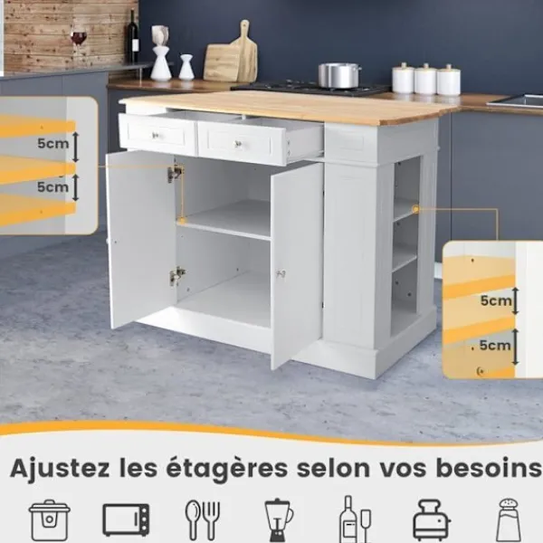 Denna COSTWAY köksö är ett utmärkt val för ditt hem! Den har en stor bänkskiva i gummi, praktiska lådor, sidostöd och ett 2-dörrars skåp för den perfekta förvaringslösningen. Hyllor i sidoställ och skåp kan justeras i 3 olika höjder för att möta dina förvaringsbehov.