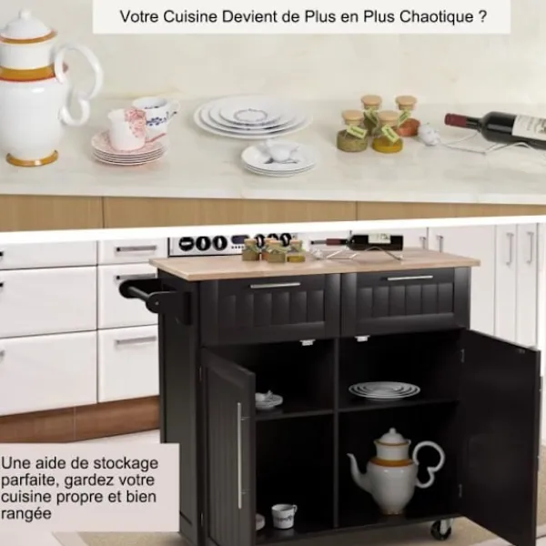 Tillverkad av högkvalitativt furu och gummiträ för ökad hållbarhet 4 universella hjul (2 låsbara) för enkel förflyttning och fastsättning 2 djupa lådor och 2 stora skåp erbjuder gott om förvaringsutrymme Justerbar hylla i 3 positioner för att möta olika användningsbehov Perfekt för kök, matsal, bar Totala dimensioner: 94 x 45 x 94,5 cm (L x B x H)
