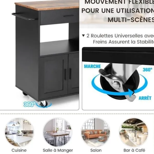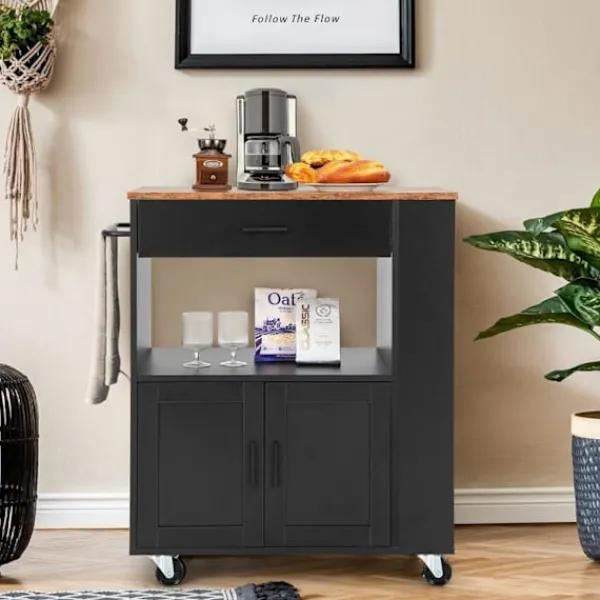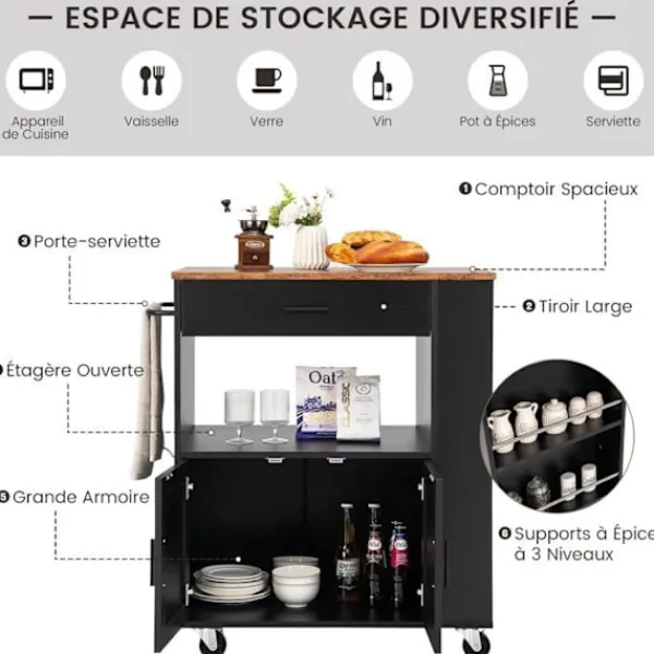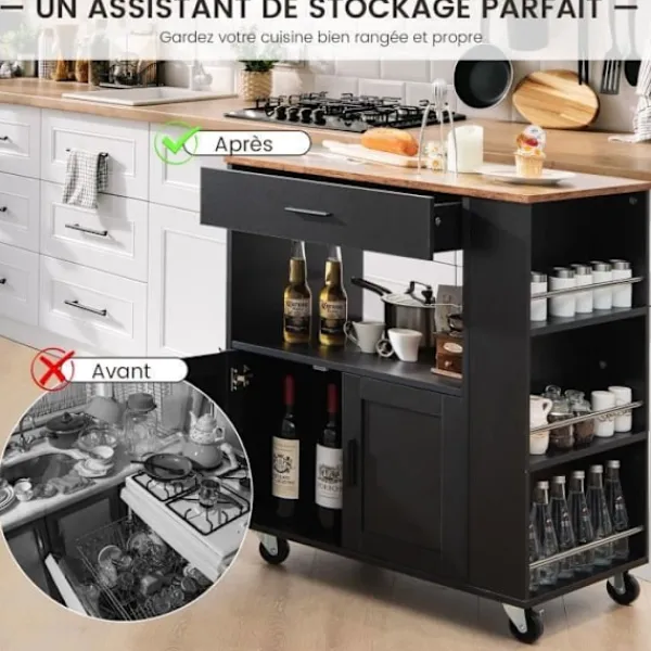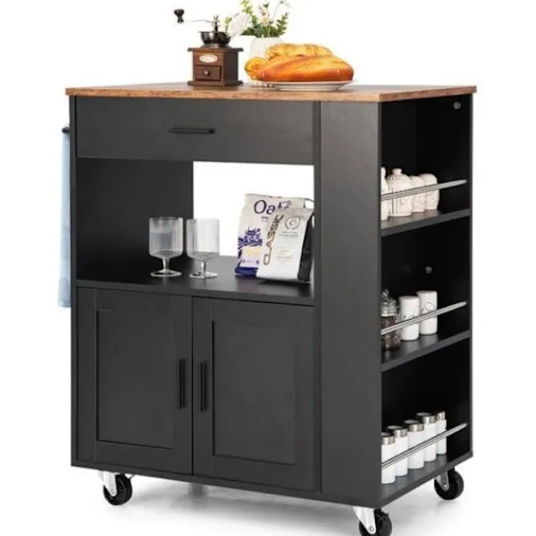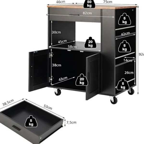 Den här köksö-vagnen är en stor hjälp för att hålla ditt kök välorganiserat. Förutom att placera färdiglagad mat och köksredskap på den rymliga bänkskivan kan du förvara disk, små apparater, flaskor och viner i lådan, öppen hylla och stort skåp.