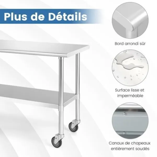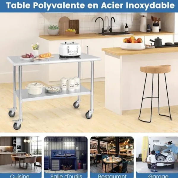 Design med dubbla lager och stor bordsskiva 122 x 61 x 90 cm Justerbar hylla på höjd 4 universella hjul varav 2 med broms för stabilitet Robust material i rostfritt stål, rostfritt och korrosionsbeständigt Genomtänkt design med rundade kanter Maximal bäruppgift för bordsskivan: 150 kg Perfekt i köket, baren, restaurangen eller vilken annan kommersiell miljö som helst