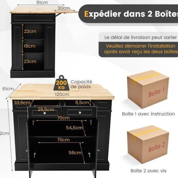 Lådder, sidohyllor och garderob med 2 dörrar för tillräckligt med förvaringsutrymme > Levereras i 2 lådor, som kan anlända vid olika dagar > 3 justerbara hyllnivåer för att förvara artiklar i olika höjder > Material: gummiträ, MDF, ingenjörsträ > Total dimension: 120 x 61 x 92 cm (L x B x H) > Bredd med lucka öppen: 91 cm > Maximal viktkapacitet för bänkskivan: 200 kg