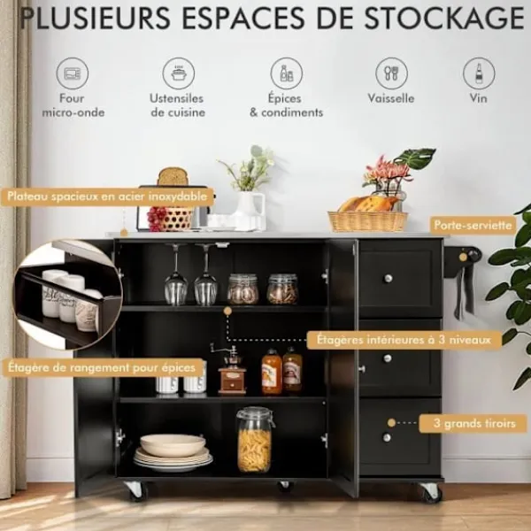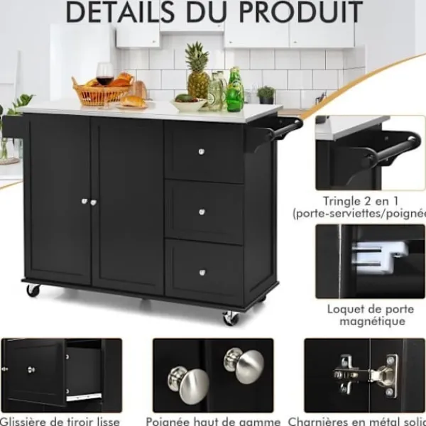 5 flexibla hjul (2 låsbara) för enkel flyttning och fixering – 3-läges justerbara hyllor för förvaring av föremål i olika storlekar – Handdukshängare kan användas som handtag – Bänkskivan i rostfritt stål är slitstark och lätt att rengöra – Lämplig för kök, matsal , restaurang, bar – Material: rostfritt stål, MDF – Mått: 135×45,5×91,5cm