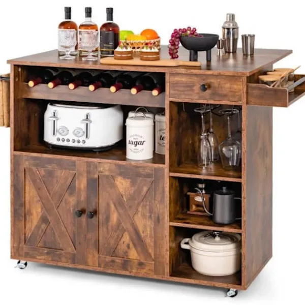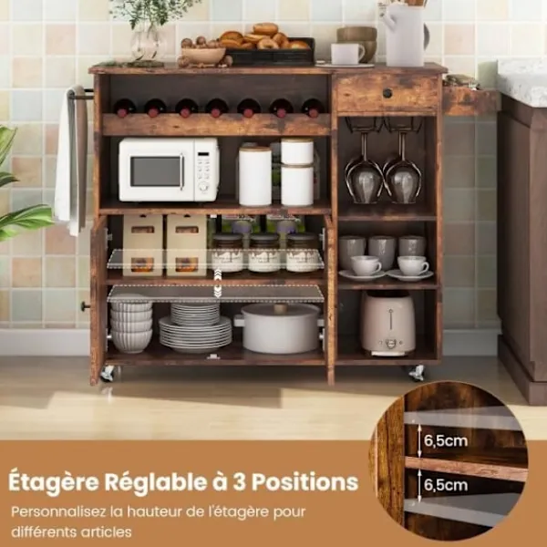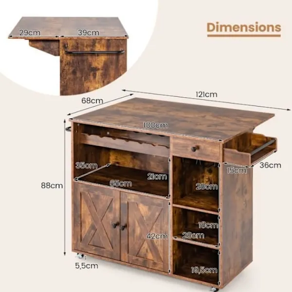 4 svängbara hjul (2 låsbara) för enkel förflyttning och fastsättning >Vinlådan kan rymma upp till 7 flaskor vin >Praktisk handdukshållare/tryckhandtag för olika användningar >Köksvagn med vikbart bänk som ger extra utrymme för matberedning >Justerbar hylla med 3 positioner för praktisk placering av föremål i olika storlekar >Material: spånskiva, metall >Totala dimensioner (fullt utvikt): 121x68x88 cm >Avstånd mellan positionerna för de justerbara hyllorna: 6,5 cm