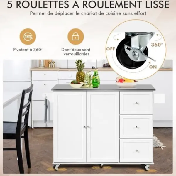 5 flexibla hjul (2 låsbara) för enkel flyttning och fixering 3-läges justerbara hyllor för förvaring av föremål i olika storlekar Handdukshängare kan användas som handtag Bänkskivan i rostfritt stål är slitstark och lätt att rengöra Lämplig för kök, badrum, restaurang, bar Material: rostfritt stål, MDF Mått: 135×45,5×91,5