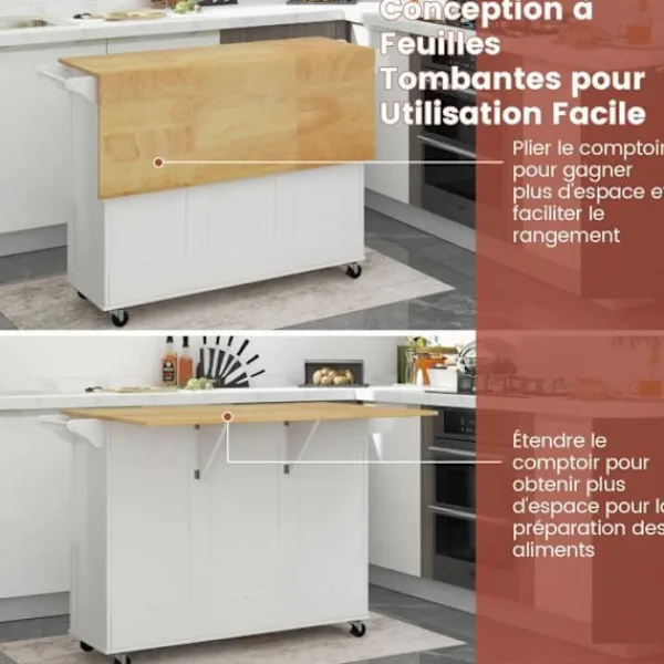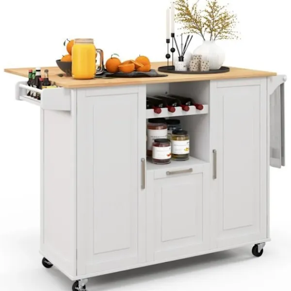 Den här rullande köksvagnen med en bladbänk av gummiträ erbjuder gott om förvaringsutrymme. Den har 2 dörrskåp, 1 skjutlåda, 1 vinställ, 1 öppet skåp, 1 handduksställ och 1 kryddhylla för att möta dina behov. Idealisk för förvaring av vin, frukt, kryddburkar och köksmaskiner.