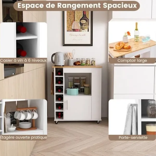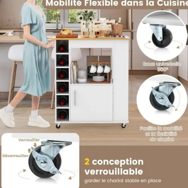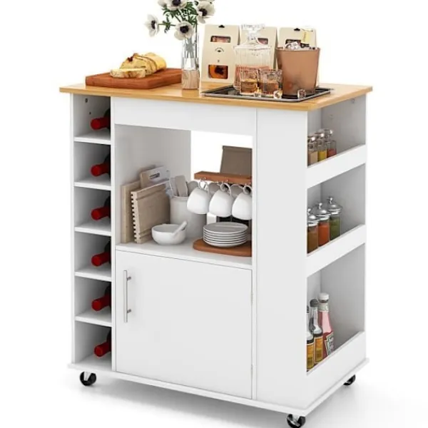COSTWAY köksvagn är en praktisk och elegant köksmöbel. Den är utrustad med 4 flexibla PU-hjul, en vattentät och hållbar bänkskiva i bambu, ett vinställ som rymmer 6 flaskor, ett kryddställ, ett skåp med dörr och ett öppet fack för organiserad förvaring.