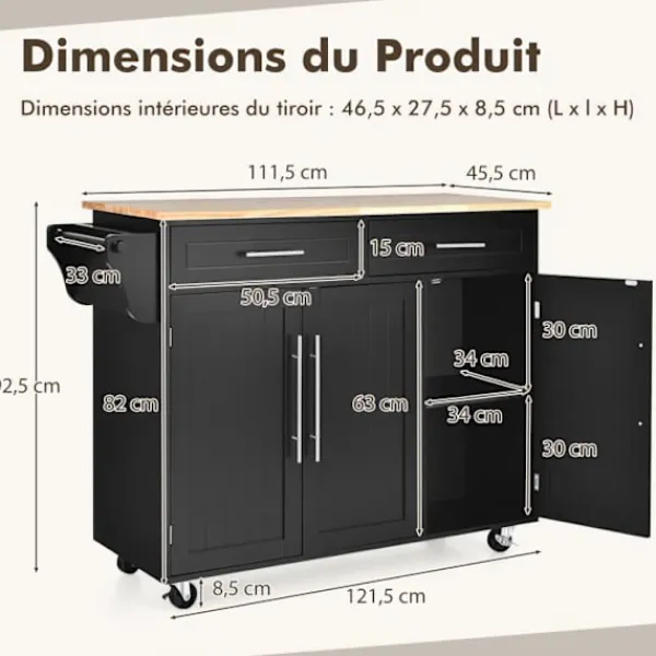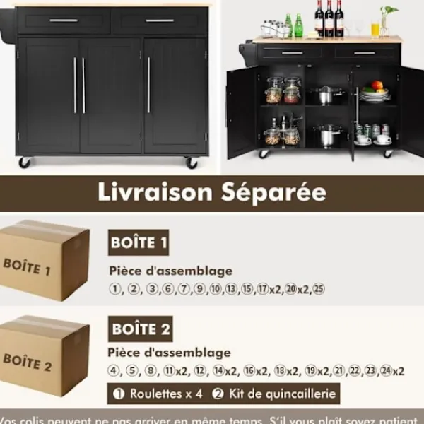 Produkten är packad i 2 separata lådor, som kan anlända vid olika tidpunkter 4 flexibla svängbara hjul (2 låsbara) för enkel förflyttning och fastsättning 3 justerbara hyllor inbyggda för att förvara artiklar av olika storlekar Handdukshållare och sidoknivhållare för mer renlighet och säkerhet Material: MDF, Gummiträ Totala mått: 121,5×45,5×92,5
