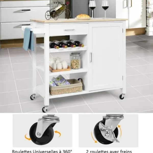 Lådor, flaskställ, skåp och öppna hyllor för organiserad förvaring 4 universalhjul (2 låsbara) 4 furuben för god stabilitet och lastkapacitet Bänkskivan av gummiträ är slät och lätt att rengöra