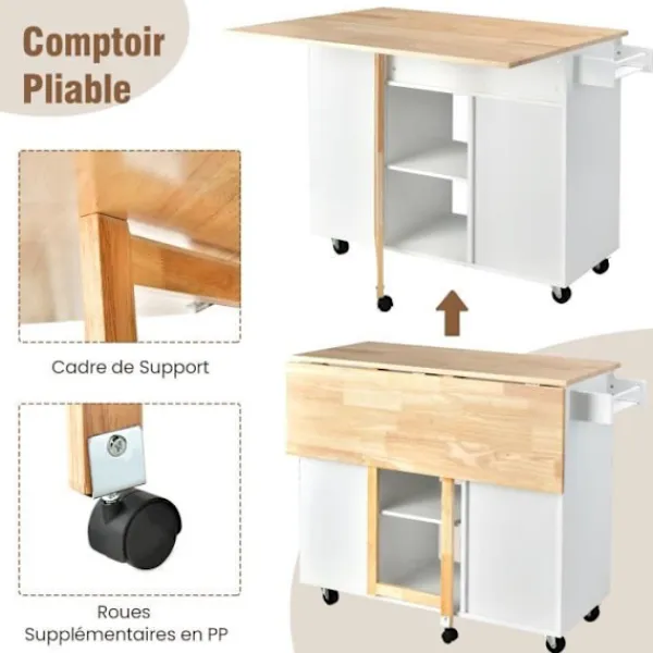Fällbordet med nedfallande blad gör det möjligt att utöka det extra utrymmet. Justerbara hyllor i 3 positioner i skåpet för att lagra föremål av olika höjder. 5 flexibla roterande hjul, varav 2 är låsbara. Kryddhylla på ena sidan för enkel åtkomst. Material: gummiträd, MDF, ingenjörsträ. Totala mått: 124x76x92 cm. Vikta mått: 124x43x92 cm.