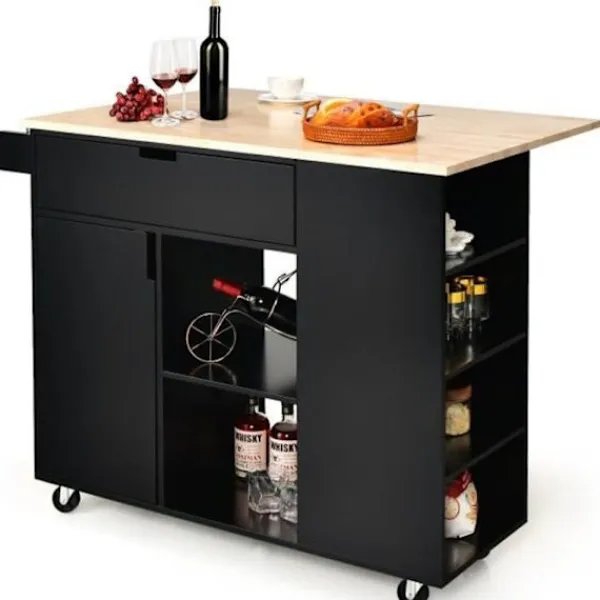 Falling leaf counter gör att du kan utöka det extra utrymmet Justerbara hyllor i 3 positioner i skåpet för att förvara föremål av olika höjd 5 flexibla svängbara hjul, varav 2 är låsbara Kryddhylla på ena sidan för enkel åtkomst Material: gummiträ, MDF, ingenjörsträ Totala mått: 124x76x92 cm Fällda mått: 124x43x92 cm