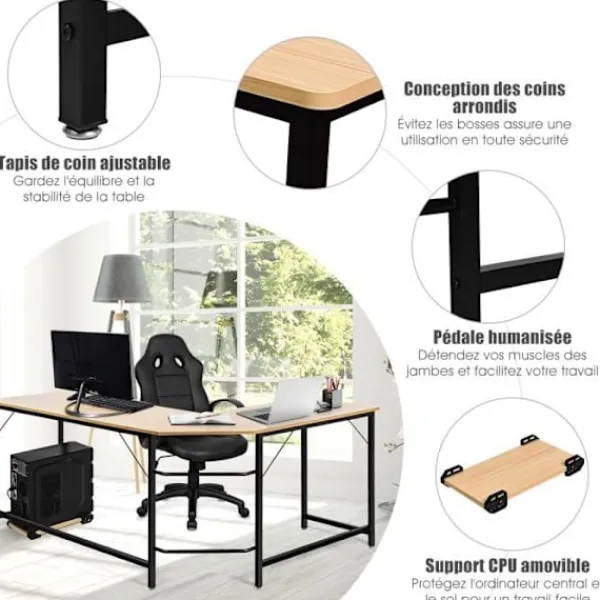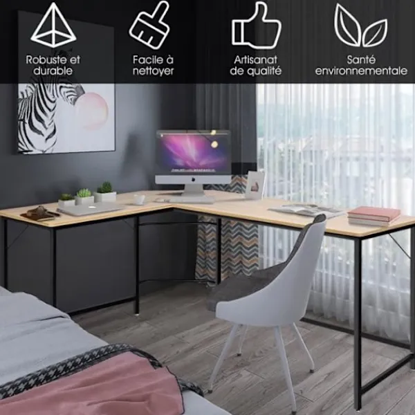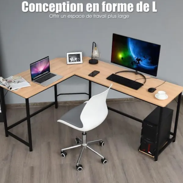Huvudmaterial: Trä Rumsekonomi med L-formad bord Dimension: 168 x 125 x 74cm Stöddimension: 40 x 21 x 6cm Mer säkert med rundade hörn Kraftig stabilitet med rörram i järn Mer praktiskt med 6 justerbara metallfötter Separat stöd för att placera centraldatorn Stort bord för 2 personer att arbeta eller studera vid