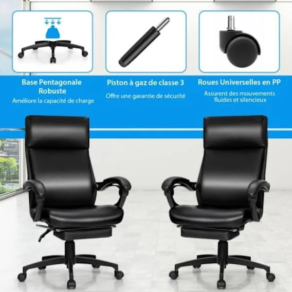 Ryggstödet justerbart från 105 till 145°. Den breda sitsen är fylld med svamp. Med 14″ infällbart nackstöd, armstöd och fotstöd. Den tysta kontorsstolen med universalhjul. Material: PVC-läder, Sydd läder. Sitsstorlek: 51×45,5 cm. Rygghöjd: 74 cm. Sitthöjd: 47-57 cm. Basens diameter: 32,4 cm. Nettovikt: 17,2 kg.