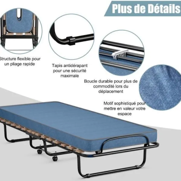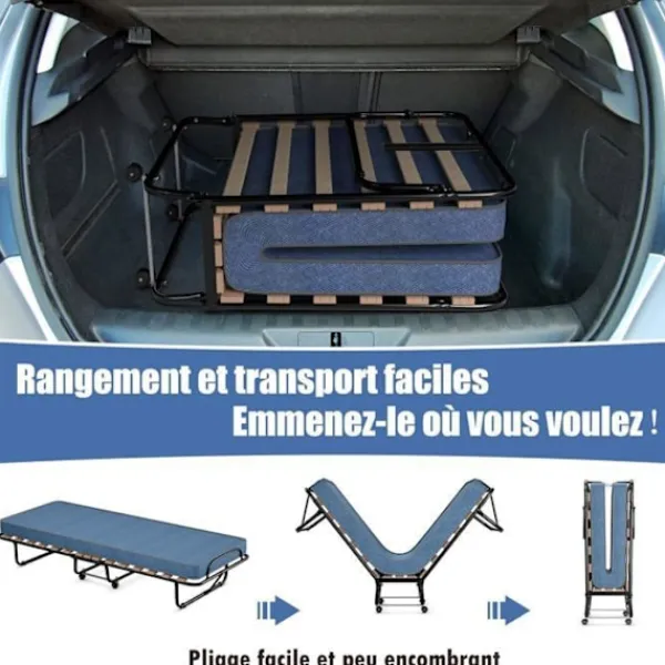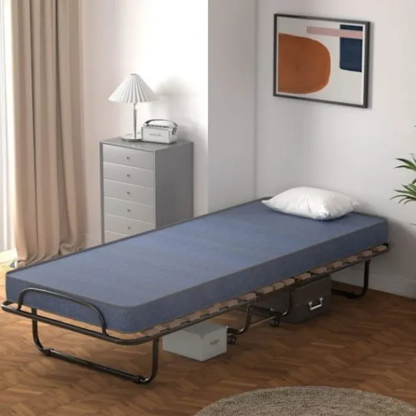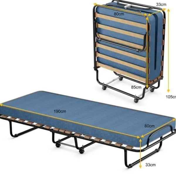 > LIT TILLVERKAD I ITALIEN! > Fällbar design för enkel förvaring utan att ta upp plats > Robust metallkonstruktion för att säkerställa bra stabilitet > 6,5 cm tjockt högdensitets skum för en bekväm sömn > 4 flexibla hjul för enkel rörlighet > Tillverkad i Italien > Material: Stål + Minneskum + Polyuretan > Mått: 190 x 80 x 33 cm (L x B x H) > Viktkapacitet: 130 kg