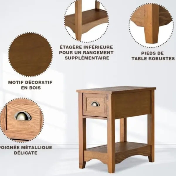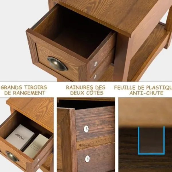 Det rymliga bordet på 56 x 33 cm Tjock MDF-panel och stabila gummiträben En låda och en hylla längst ner för mycket förvaringsutrymme Den släta ytan är lätt att rengöra och underhålla Metallhandtag för enkel öppning och stängning